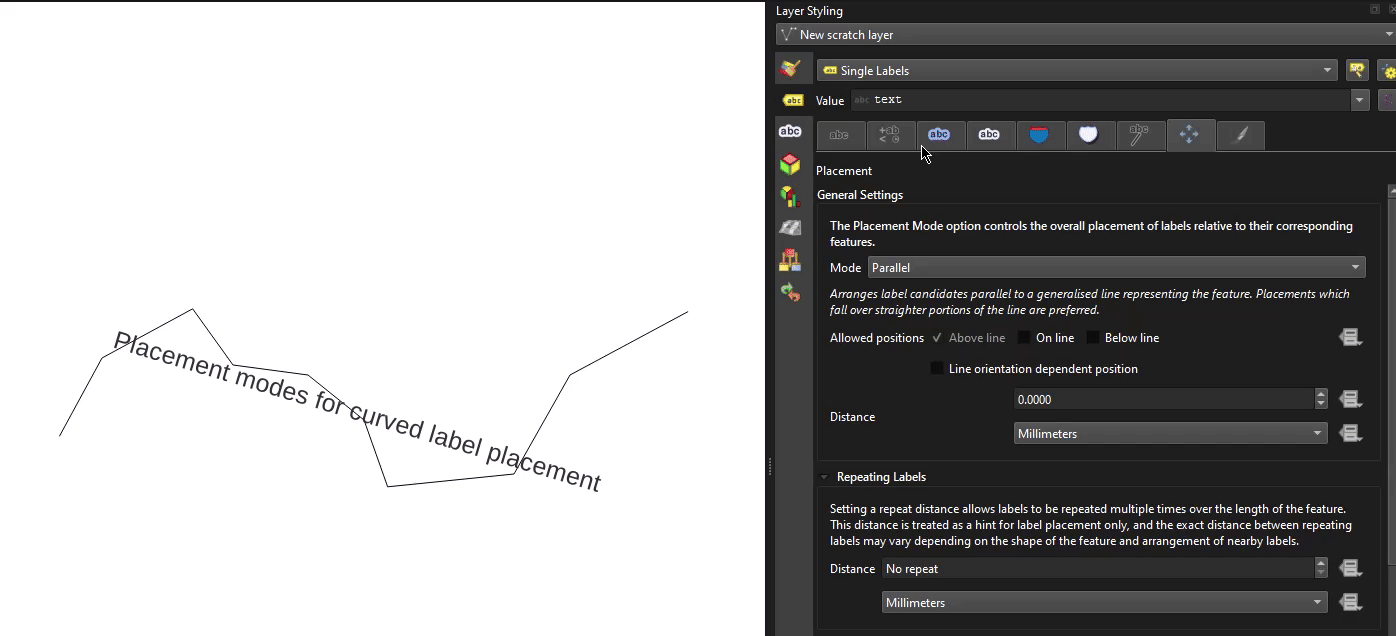 Newly added placement “modes” are now available for use with curved labels, allowing for much more fine-grained control over how text is positioned when using curved labels, in line with QEP 404.